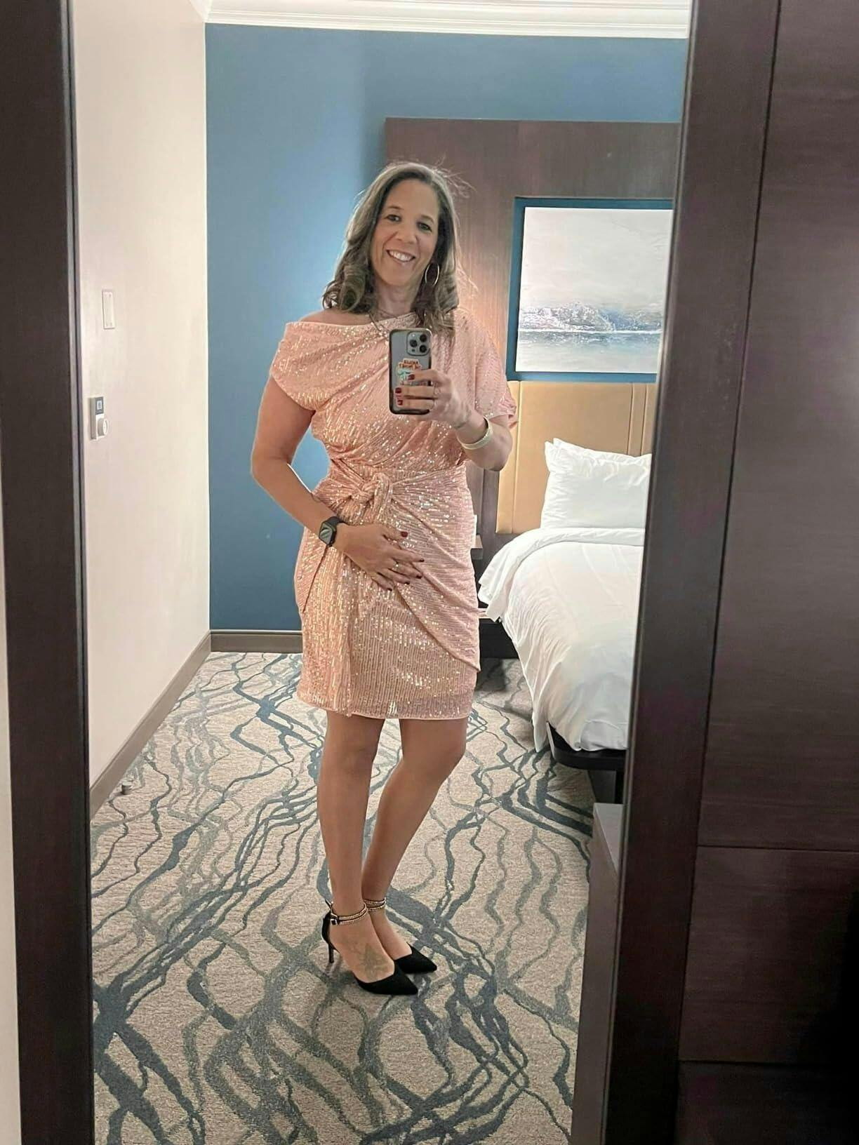 Wore this to a friends wedding. It was fine for the occasion. Not a dress that’s well made and you could wear over and over. Forgiving in your mid-section! I am 5’5” 145 lbs and the medium fit great.